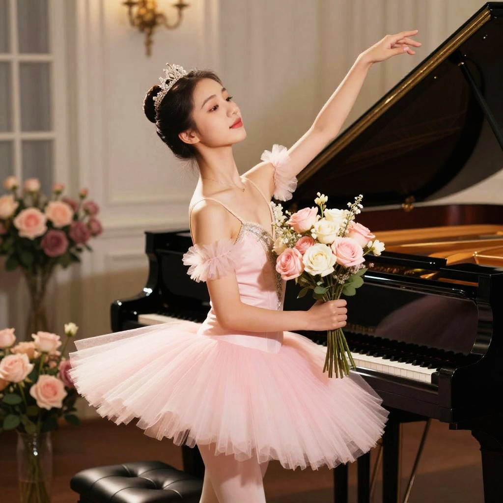 A captivating scene featuring a graceful ballet dancer seated at a grand piano, holding a bouquet of elegant flowers. The dancer's delicate pink tutu and sophisticated hairstyle complement the soft, romantic ambiance of the room adorned with roses.