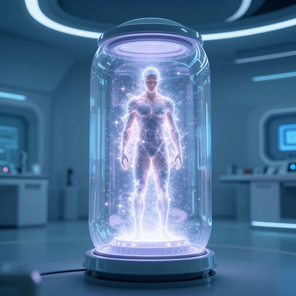 Photograph of a futuristic laboratory scene featuring a transparent cylindrical chamber with a glowing, ethereal human figure inside. The figure, illuminated in bright white and blue lights, has a luminescent, almost electric appearance with sparkles around it, suggesting a bioelectric or holographic representation. The chamber is centered in the image, with a blurred background showing sleek, modern laboratory equipment, including monitors and control panels, against a gray, circular-walled room. The overall scene has a sci-fi, high-tech aesthetic with a cool color palette dominated by whites, blues, and grays.