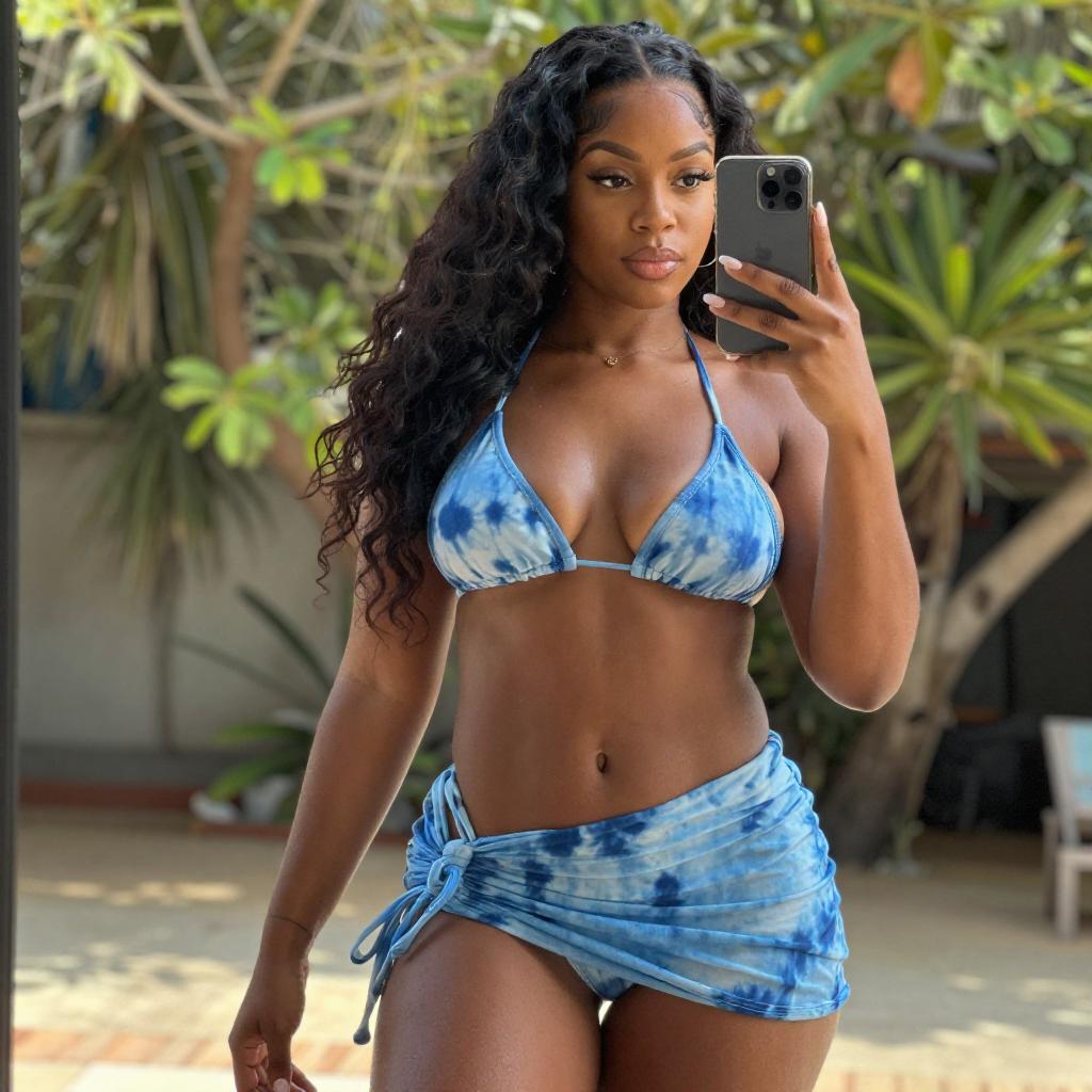 Photograph of a smiling Black woman with long straight black hair, wearing a light blue tie-dye hoodie with the hood up, and gray Calvin Klein panties. She holds a yellow smartphone in her right hand, showcasing her toned, muscular abdomen. The background is a blurred indoor setting with dark and light-colored walls.