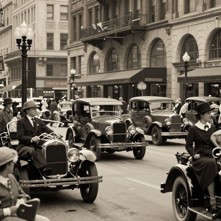 1924 city street scene bustling with vintage cars and people in period attire, classic 1920s architecture with street lamps, detailed textures evoking a lively urban atmosphere, softly muted colors with golden hour lighting