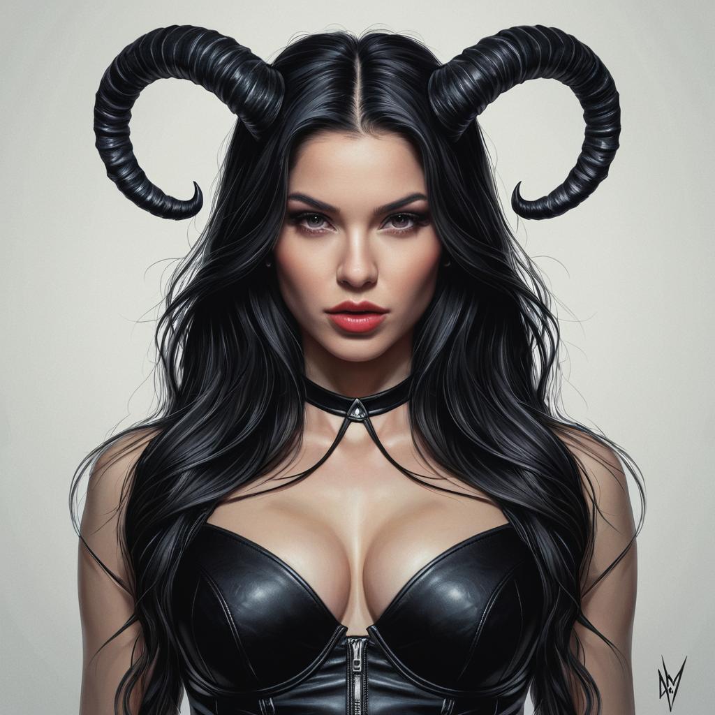 Artistic digital portrait of a confident female demon with symmetrical black curled horns and long flowing black hair. She is wearing tight black leather lingerie with a zipper front and a matching choker. The image highlights her flawless skin, captivating eyes, and red lips, rendered in a highly detailed, sharp-focus style.