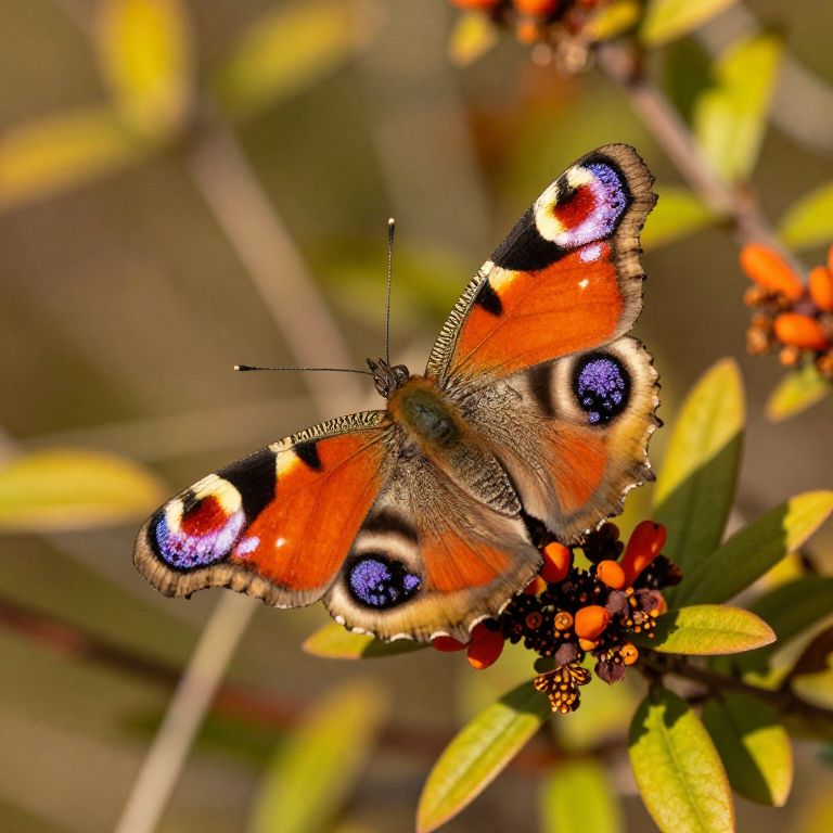 Photograph of a vibrant, orange and black butterfly with striking blue and white eye-spot patterns on its wings, perched on a cluster of small, round, red berries with green leaves. The butterfly's wings are semi-translucent with fine, black vein patterns. The background is a blurred mix of green and brown hues, highlighting the butterfly and berries in sharp focus. The image captures the butterfly's delicate, textured wings and the contrasting colors of its surroundings, creating a vivid, natural scene.