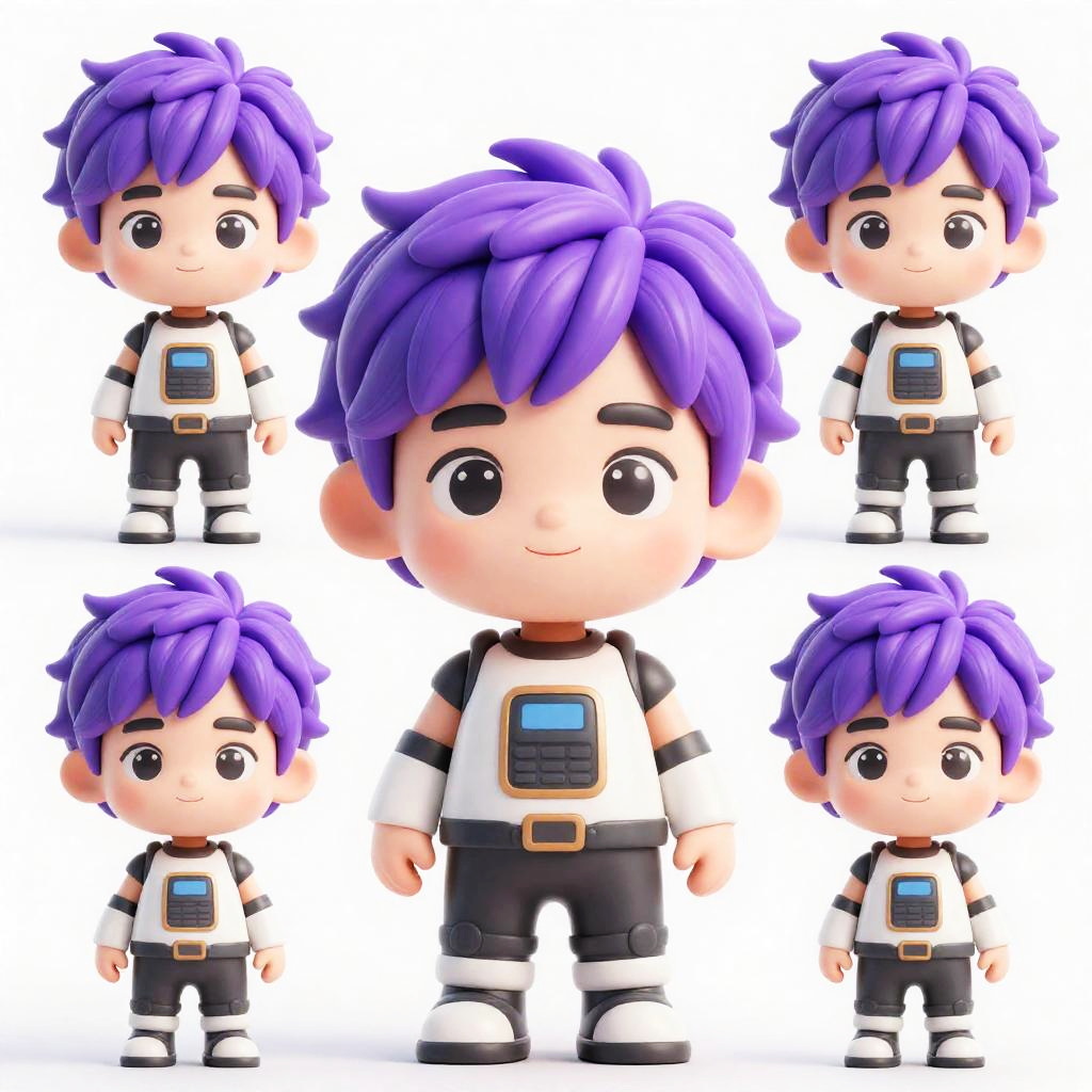 This is a digital CGI image featuring six chibi-style figurines of a young boy with vibrant purple hair and large, expressive black eyes. He wears a white and black shirt with a blue rectangular button on the chest, black pants, and white shoes with black stripes. The boy's hair is spiky and the same purple color across all figures. The six figurines are arranged in two rows against a plain white background, showing various angles and poses, including front, side, and slight turns. The style is cute and cartoonish, with a focus on rounded features and a soft, friendly expression.
