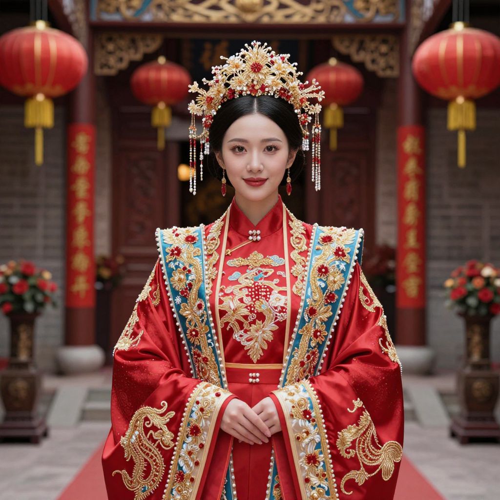 Photograph of an Asian woman in traditional red Chinese wedding attire with gold embroidery, beaded headpiece, and blue trim, standing in front of a