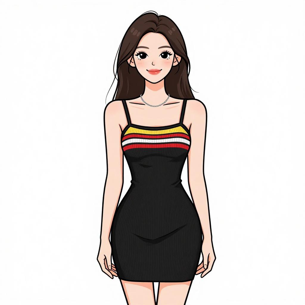 Digital anime-style drawing of a young woman with long, straight brown hair and fair skin. She has large, expressive brown eyes and a slight smile. She wears a form-fitting, sleeveless black dress with thin straps, featuring a yellow, red, and white horizontal stripe across the chest. The background is plain white, emphasizing her figure. The dress accentuates her slim, hourglass physique, with her arms relaxed by her sides. The drawing uses bold, clean lines and vibrant colors, typical of anime art.