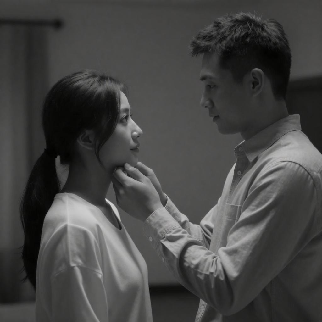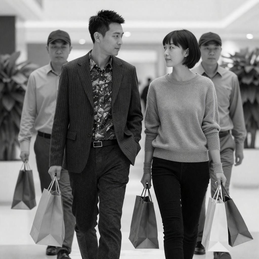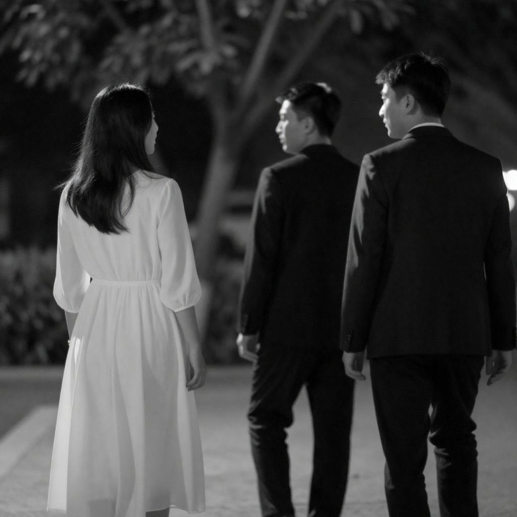 Black-and-white photograph of three people walking at night. A woman in a long white dress stands on the left, facing two men in dark clothing on the right. The background is blurred with tree branches. High contrast highlights their silhouettes and ures.