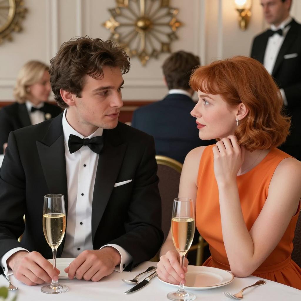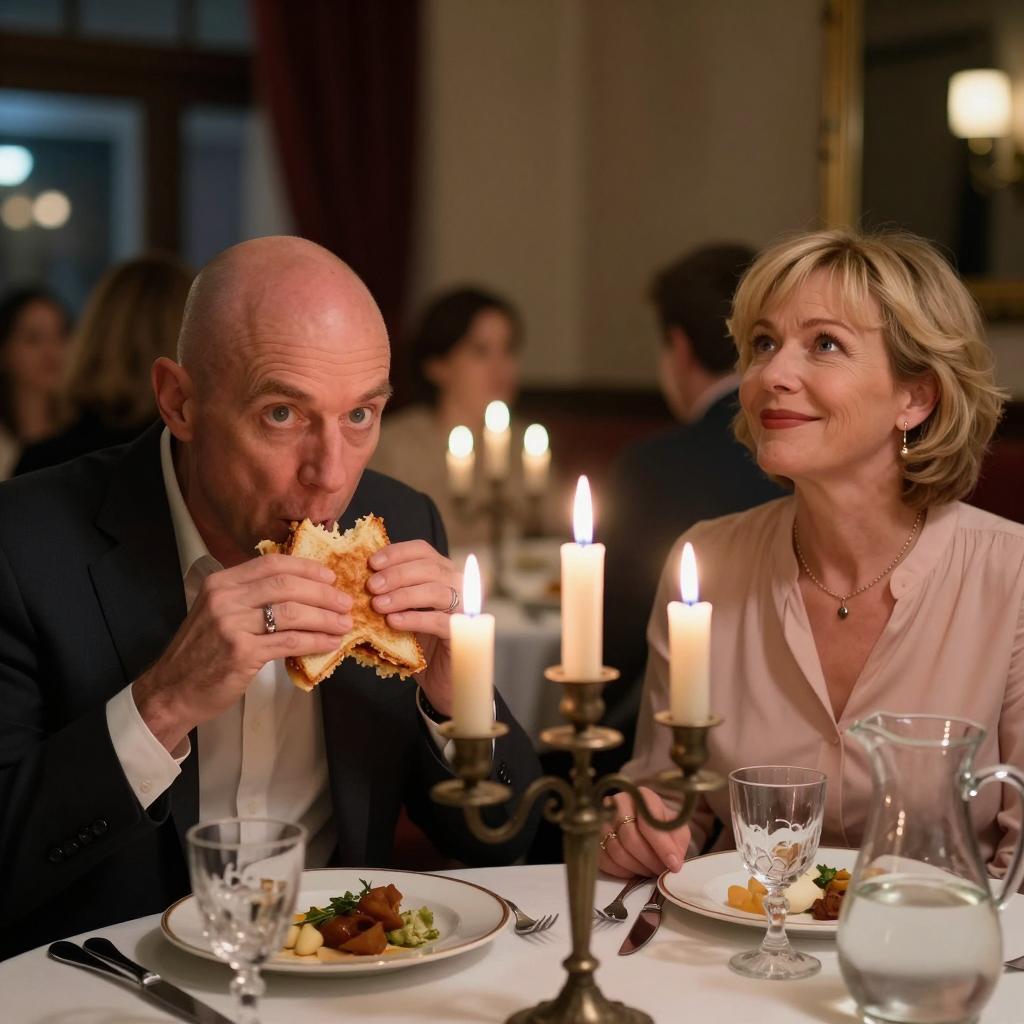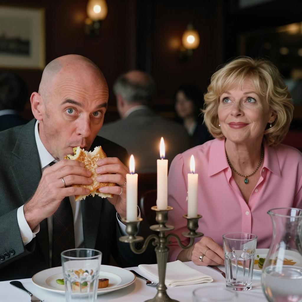 A dimly lit restaurant. Bald man with large, hollow eyes, dark suit, eating a sandwich. Blonde woman with short hair, pink blouse, necklace, looking up, smiling. Candles on black candelabrum in center. Two glasses, plates, and a pitcher on table. Background blurred, other people seated.