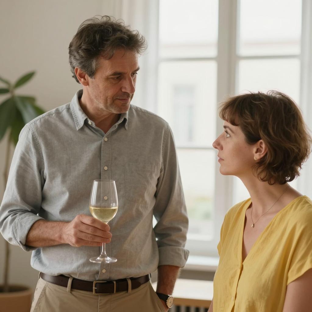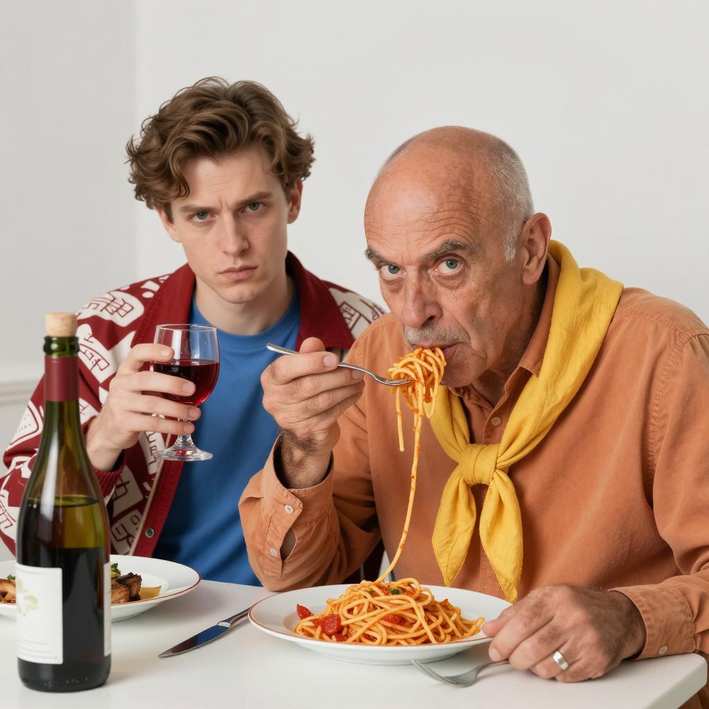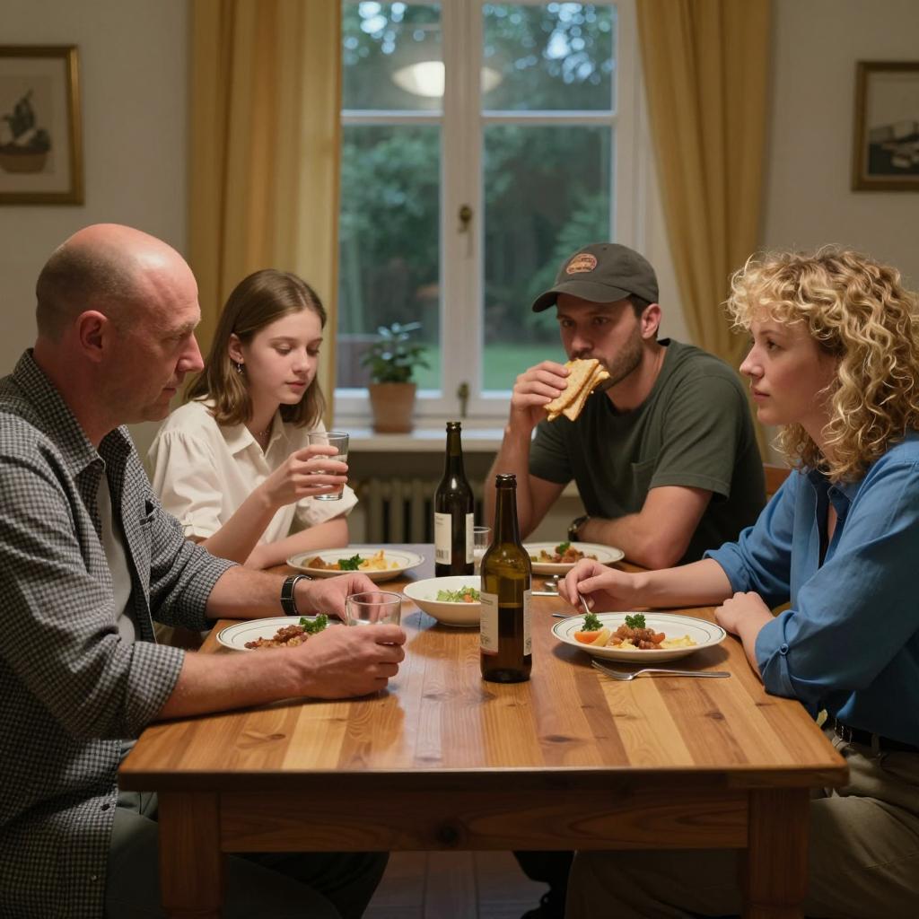 A dimly lit restaurant. Bald man with large, hollow eyes, dark suit, eating a sandwich. Blonde woman with short hair, pink blouse, necklace, looking up, smiling. Candles on black candelabrum in center. Two glasses, plates, and a pitcher on table. Background blurred, other people seated.