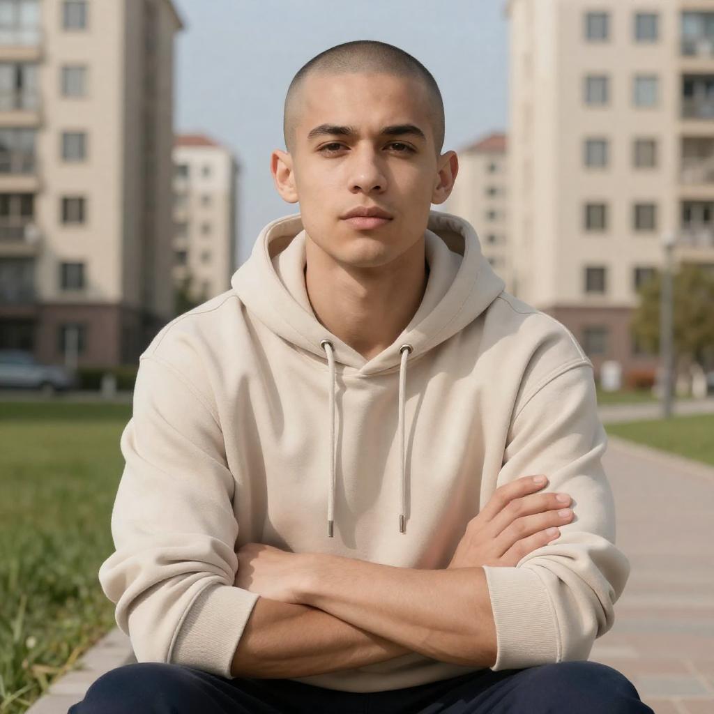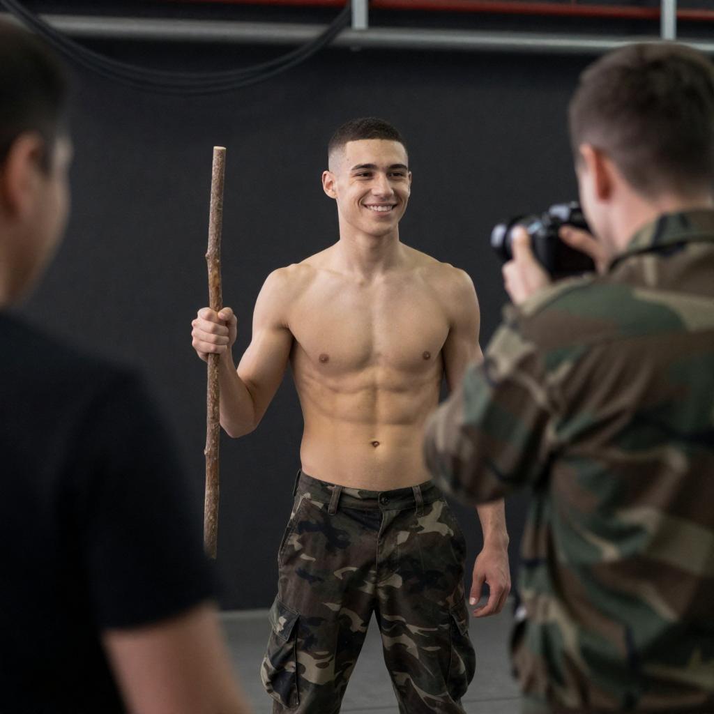 Photograph of a slender, shirtless young man with short hair, smiling, holding a stick in his right hand. He wears dark camo pants. A man with short hair, back turned, in a camo jacket points a camera at him. Dark, industrial background with coiled cables and metallic structures. Two people.