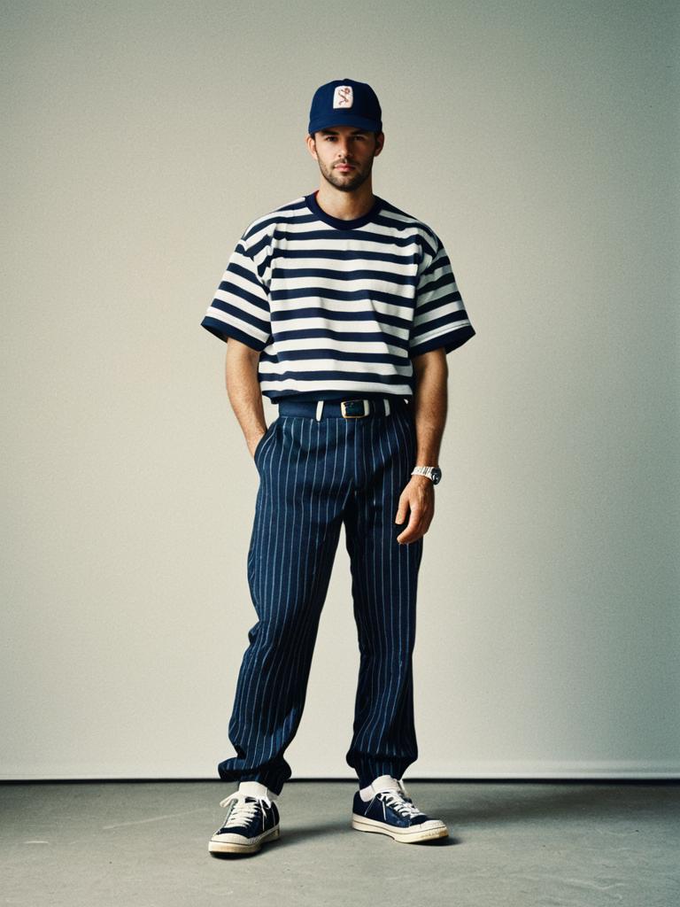 Baseball costume adult, 1boy, solo, male focus, realistic, baseball cap, hat, hand in pocket, shoes, full body, sneakers, shirt, standing, striped shirt, sportswear, pants, striped clothes