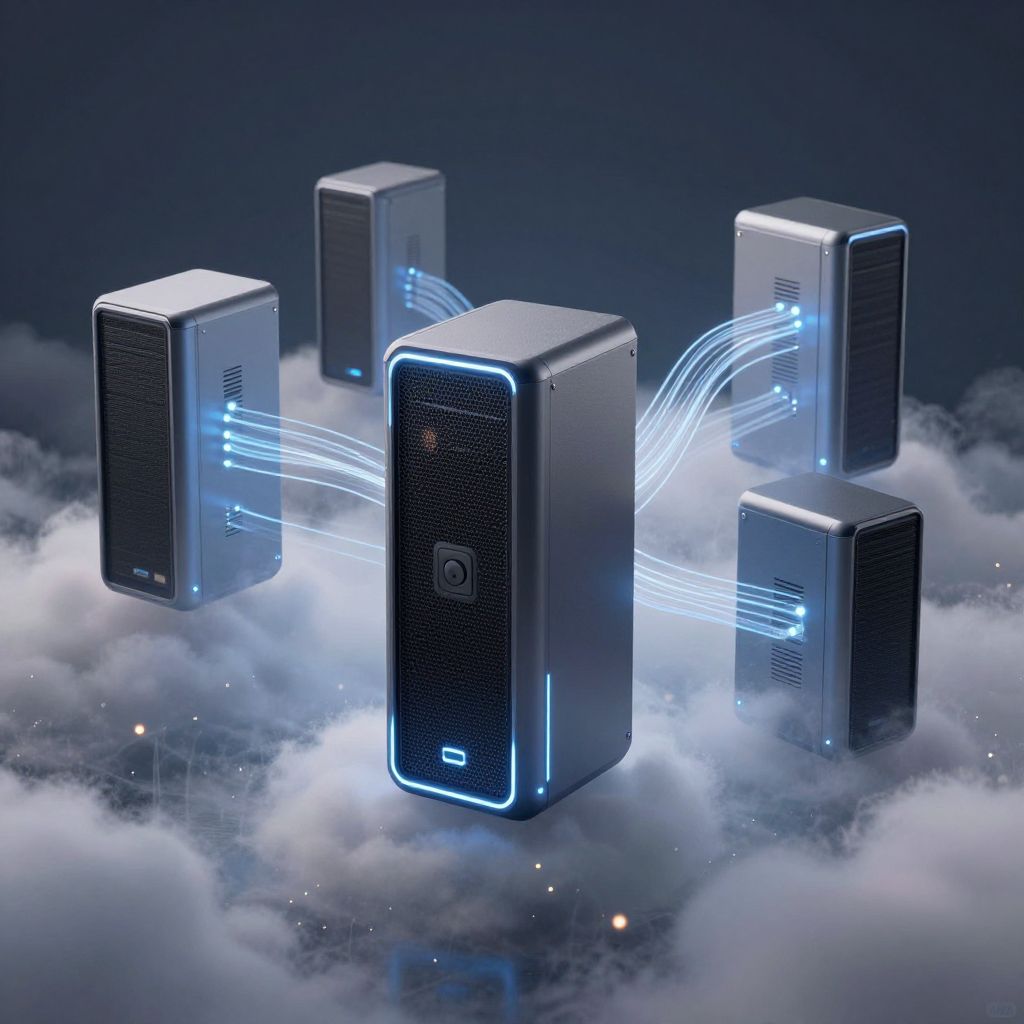 Photograph of five sleek, rectangular, black electronic speaker boxes with blue neon outlines and glowing blue lines connecting them. The speakers are floating above a layer of soft, white clouds against a dark blue, starry background. The speakers have a modern, futuristic design with textured surfaces and small ventilation grilles on the sides. The blue neon lines curve gracefully between the speakers, creating a sense of wireless connectivity and advanced technology. The image has a sci-fi aesthetic, with a focus on the interplay of light and technology.