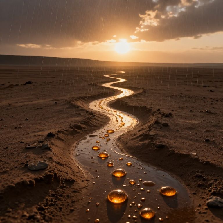 Photograph of a dramatic sunset over a barren, rocky landscape. A winding, glistening stream snakes through the center, reflecting the golden light of the setting sun. Raindrops float on the water's surface, creating a series of bright, orange reflections. The sky is partially cloudy, with dark, stormy clouds contrasting the warm, orange glow of the sun. The horizon is visible in the distance, and the ground is textured with small rocks and uneven terrain. The image captures a sense of isolation and natural beauty, with a striking interplay of light and shadow.