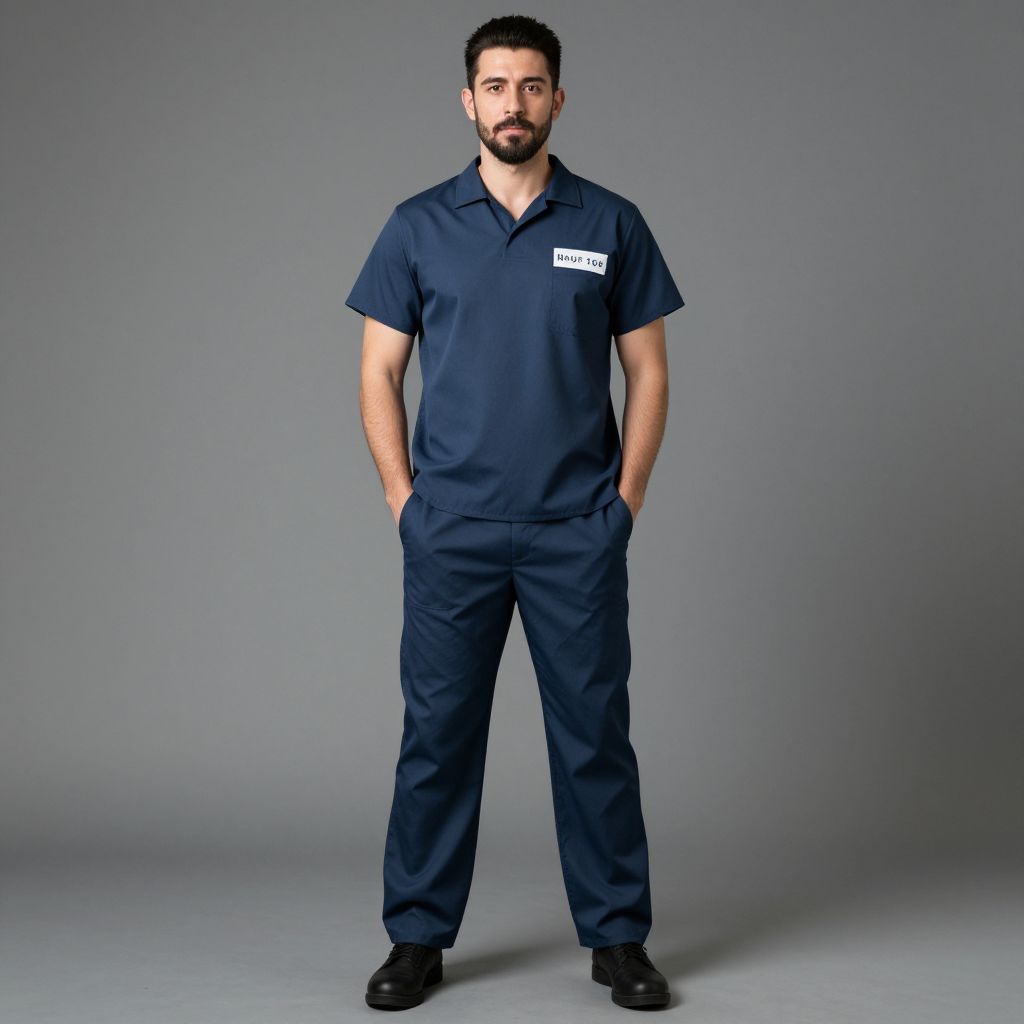 Adult inmate costume male, 1boy, solo, male focus, beard, facial hair, black hair, full body, hands in pockets, standing, mustache, shirt, pants