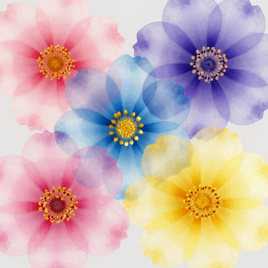 This is a vibrant, digital art piece featuring a close-up of colorful, abstract flowers. The image is filled with overlapping petals in shades of pink, blue, purple, and yellow, creating a kaleidoscopic effect. Each flower has a detailed, golden center, adding texture and depth. The petals have a semi-translucent, watercolor-like quality, blending seamlessly into one another. The background is a soft gray, making the colorful flowers pop.
