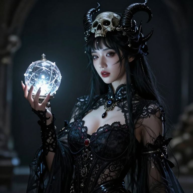 Photograph-style digital art: Asian woman in white dress reading in dim library, monstrous horned beast with sharp teeth looms behind.