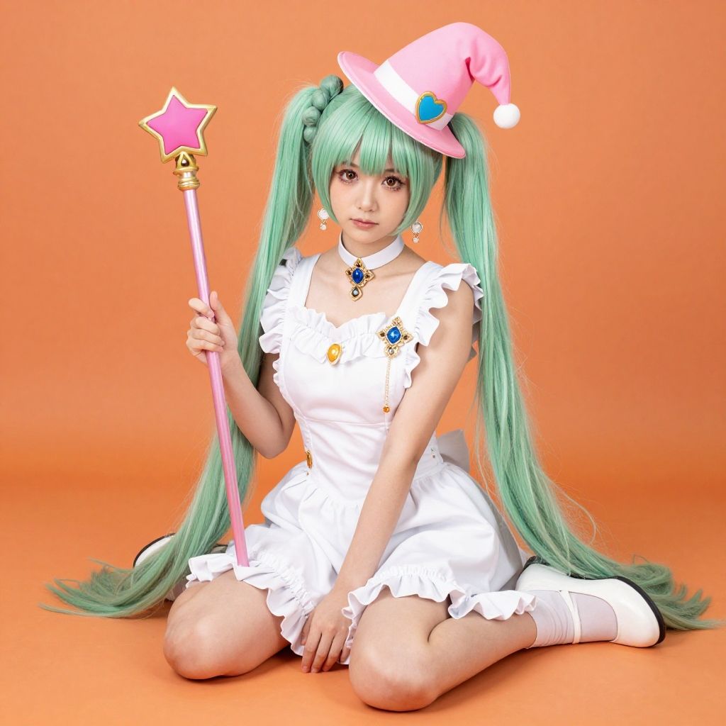 Urushihara satoshi, 1girl, solo, long hair, looking at viewer, bangs, skirt, hair ornament, hat, dress, twintails, brown eyes, jewelry, sitting, very long hair, full body, earrings, frills, green hair, shoes, white dress, orange eyes, parted bangs, bare legs, kneeling, low twintails, wariza, magical girl, hair bobbles, staff, brooch, seiza, v arms, orange background, wand, zoom layer, pink headwear, 1990s \(style\), jester cap, light green hair