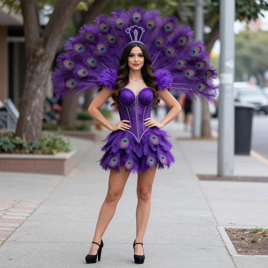 Purple Peacock Costume, purple peacock costume with feathers on a woman standing on a sidewalk