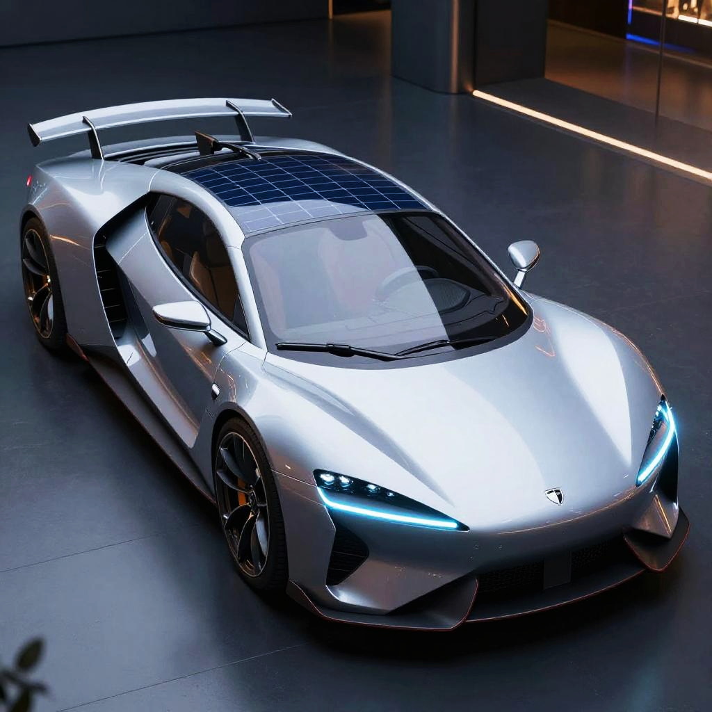 AI generated car design showcasing an electric supercar with sharp edges and smooth surfaces, transparent solar panel roof, neon blue accents, futuristic urban environment at night, high resolution, intricate mechanical details, digital art.
