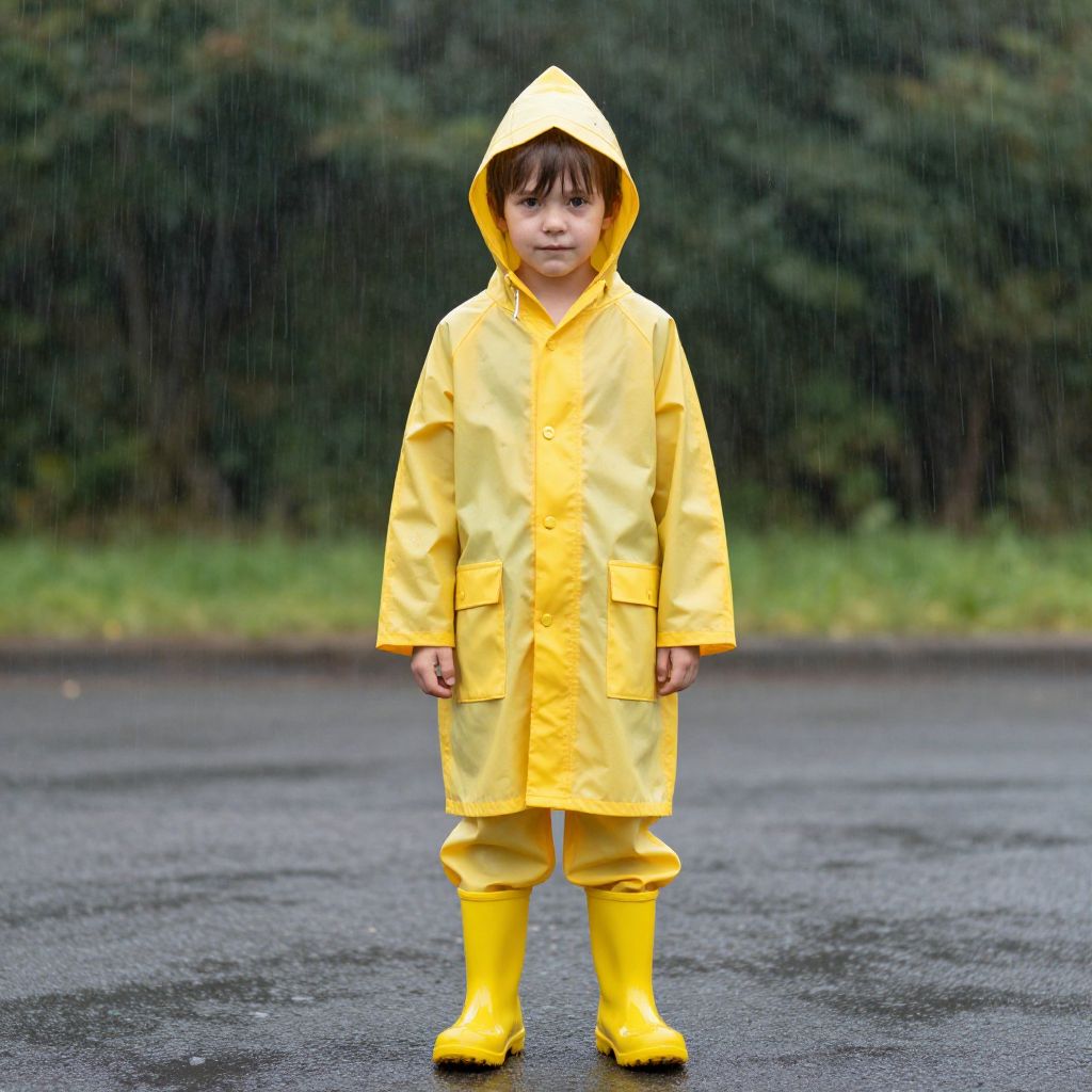 Rain cloud costume, raincoat, 1boy, male focus, solo, full body, looking at viewer, standing, yellow footwear, pants, long sleeves, brown hair, boots, hood up, hood, rubber boots