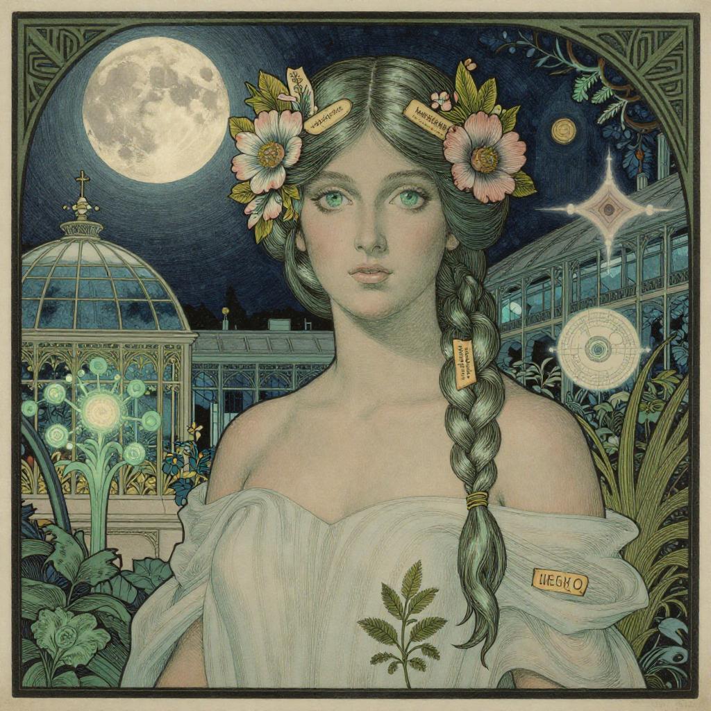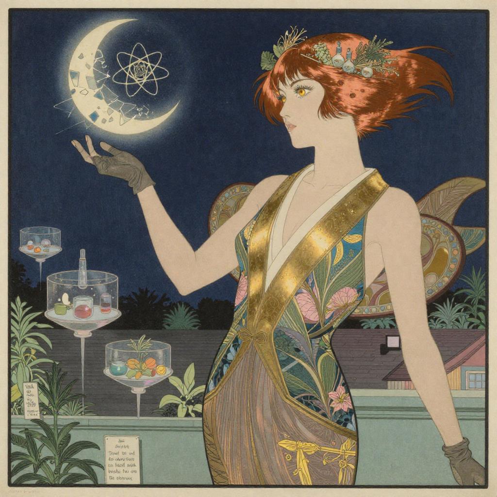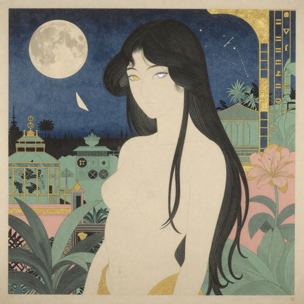 Woodblock print, Walter Crane, Art Deco style, Beautiful girl with golden hair, Queen's eyes, Mystic natural settings, Falling moon above a serene lake, detailed masterpiece