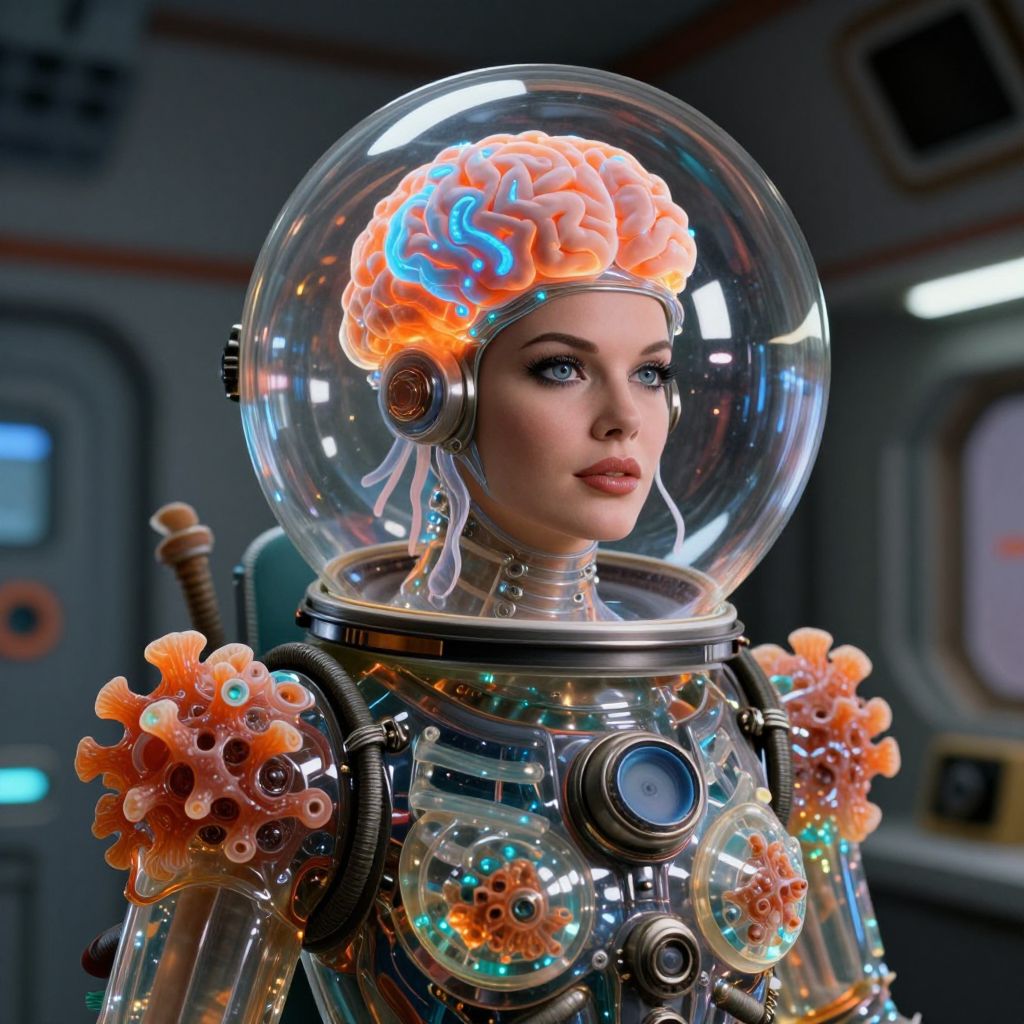 The image depicts a hyper-realistic, retro sci-fi portrait of a woman in a futuristic spacesuit, reminiscent of the 1970s California aesthetic. She is encased in a transparent glass bubble, which serves as her round glass space helmet. The helmet is adorned with an intricate, bioluminescent brain made of jellyfish, glowing in shades of orange and blue. The spacesuit is also made of glass, with a complex, organic structure that resembles coral or sea anemones. The suit's bones are made of glass, adding to the futuristic and otherworldly appearance. The overall composition is striking, with the woman's face and the helmet taking center stage, surrounded by the vibrant, otherworldly elements of her suit. The image is shot in a spaceship interior, with a wide angle lens capturing the intricate details of the suit and the helmet. The lighting is soft, highlighting the textures and colors of the glass and jellyfish brain. The image is a stunning example of 3DCG, VFX, and SFX, with a high level of detail and realism.