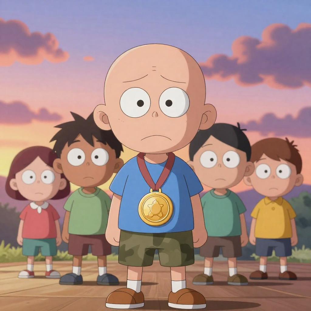 Cartoon drawing of a bald, nervous boy with wide eyes, wearing a blue shirt and camouflage shorts, holding a gold medal. Background: sunset with pink and purple clouds. Four other children with various hair colors and outfits stand behind him. Wood plank ground. Boy's expression: anxious. Children's expressions: neutral to slightly concerned.