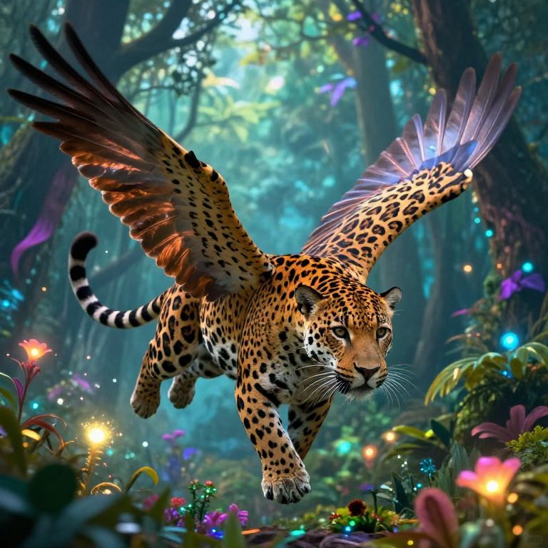 Epic scene of a jaguar with expansive wings flying through a mystical forest filled with glowing flora, ethereal atmosphere, vibrant colors, fantasy realism with intense textures on fur and feathers