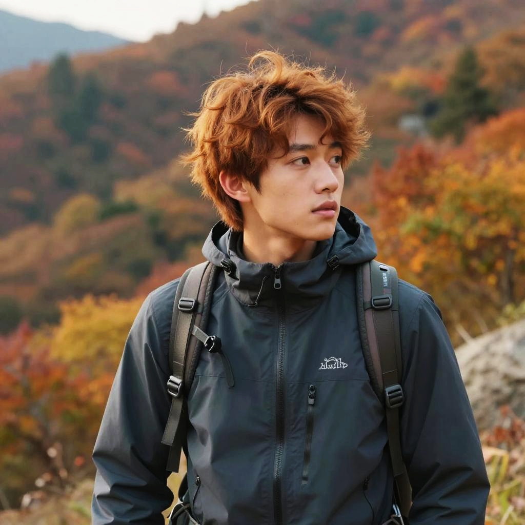 Chestnut hair male hiking in mountainous terrain during autumn, wearing outdoor gear, surrounded by colorful fall foliage, soft sunlight illuminating his textured chestnut hair, expressive and adventurous mood, photorealism with enhanced color vibrancy