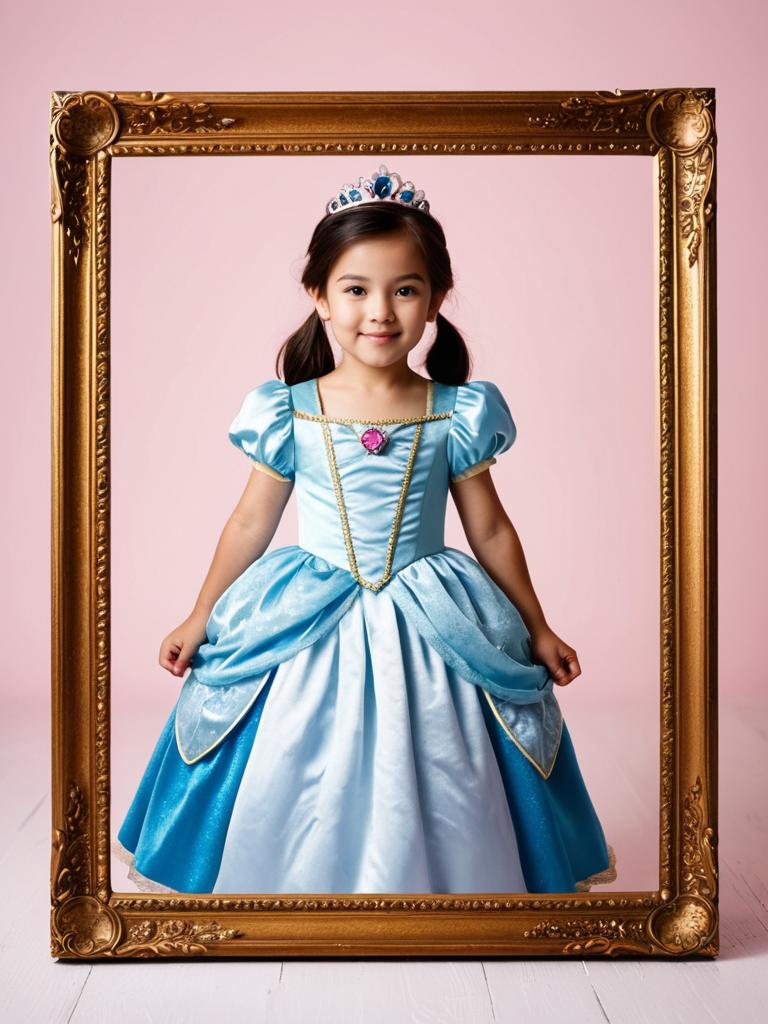 Photorealistic studio portrait of a young girl dressed as a princess wearing a shiny blue costume with gold details and a jeweled heart brooch. She has a silver tiara with blue jewels and her hair styled in pigtails. The girl is positioned inside a large, decorative antique-style gold frame against a bright white background.