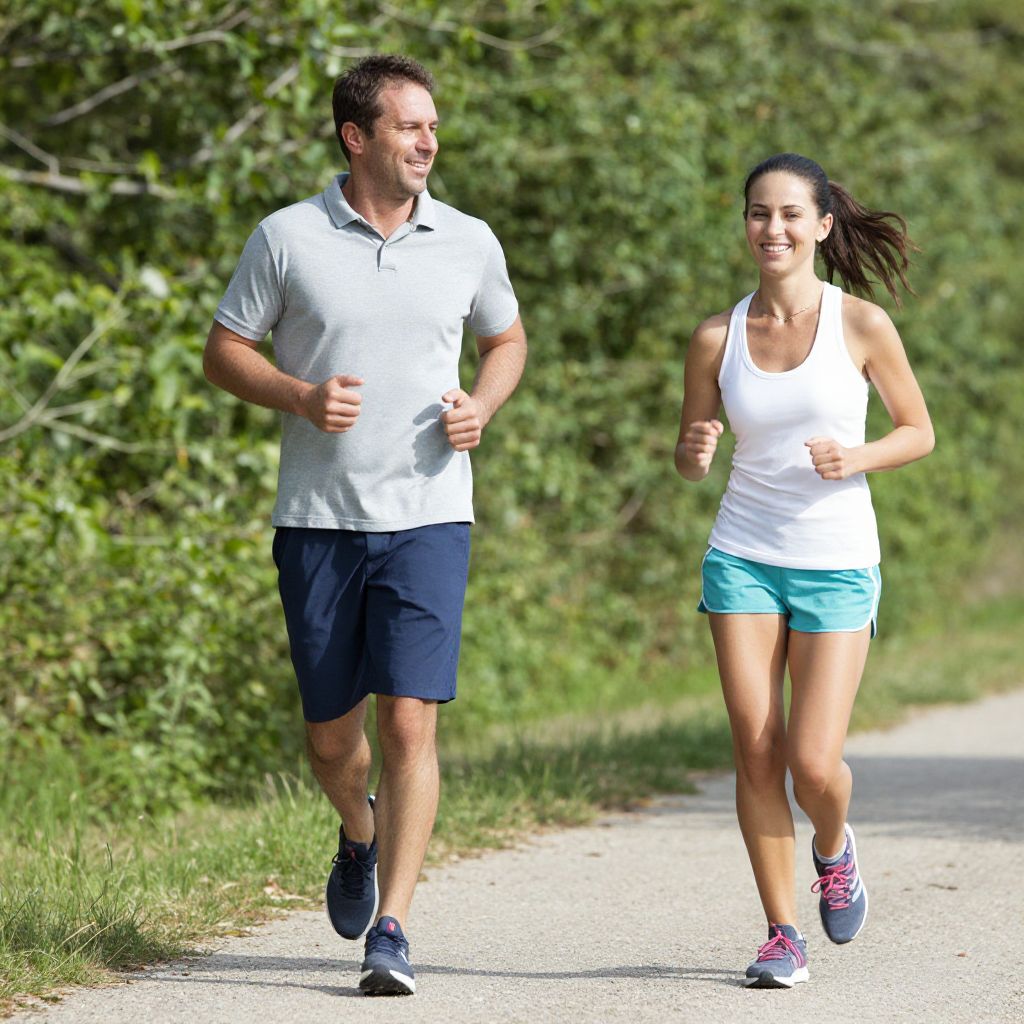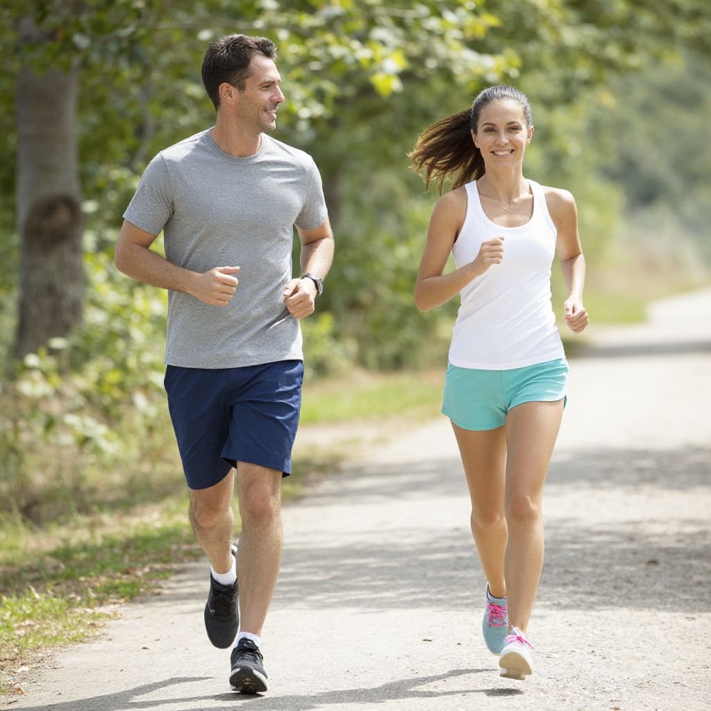 Two individuals, a man in a gray shirt and navy shorts and a woman in a white tank top and teal shorts, are running side by side along a sunlit path, their smiles radiating joy and energy as they exercise outdoors in a vibrant, natural setting.