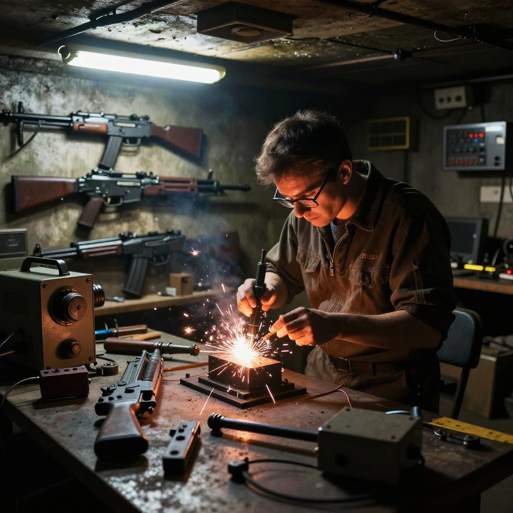 Weapon designer working late in a dimly lit underground bunker, surrounded by assorted vintage and modern weapon prototypes, gritty and rugged environment, sparks flying from welding equipment, dramatic shadows highlighting focused craftsmanship and mechanical precision.