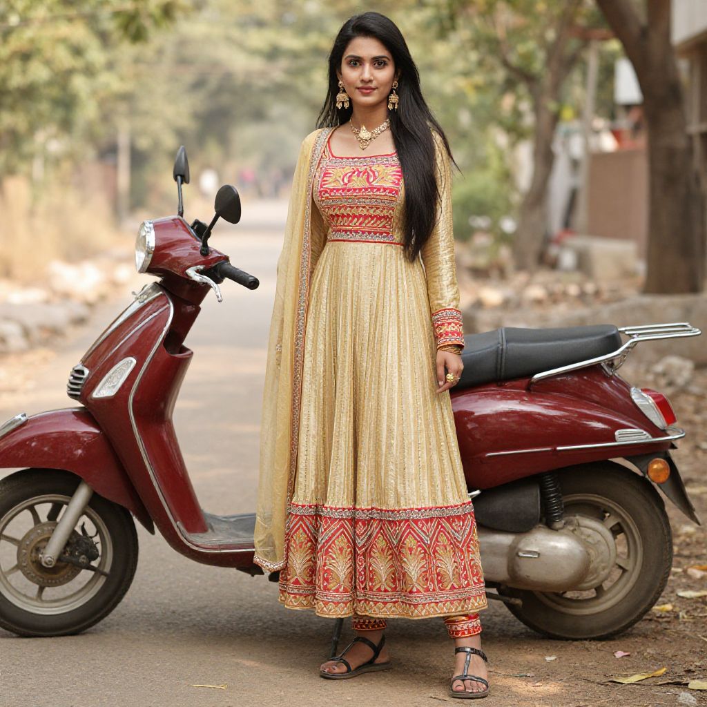 Dress bollywood retro theme, 1girl, solo, black hair, realistic, sandals, long hair, dress, motor vehicle, jewelry, standing, full body