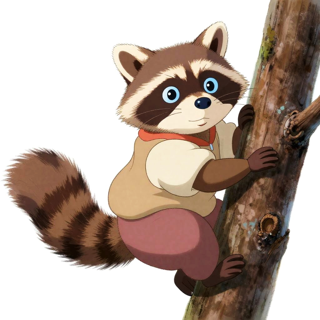 A raccoon depicted in a Ghibli-inspired pastel illustration, showcasing a bushy ringed tail. Dressed in sporty attire, it displays a focused look while climbing a tree. Its bright blue eyes are wide open, illustrated as a complete character on a transparent background, embodying the playful essence of Ghibli-inspired cartoons.