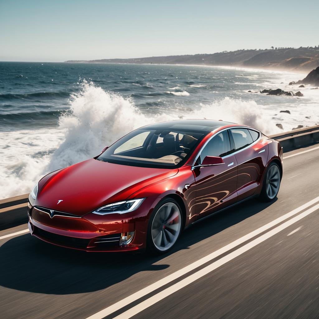 Glossy Red Audi RS7 Performance driving along a coastal highway at sunset with crashing waves, captured in motion with a telephoto lens blurring the background, evoking a thrilling sunset drive with salty sea breeze and glowing skies.