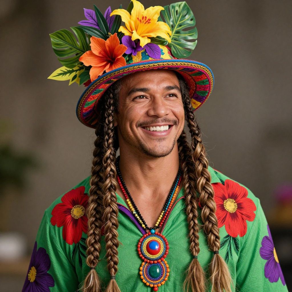 A vibrant, smiling man in his late twenties with long, intricate braids in his hair. He is wearing a brightly colored, ornate hat adorned with lush flowers and tropical leaves. His outfit consists of a striking green shirt decorated with bold red and purple flowers, and he wears a noticeable, colorful necklace around his neck. Cinematic, high detail, vibrant colors, professional photography.