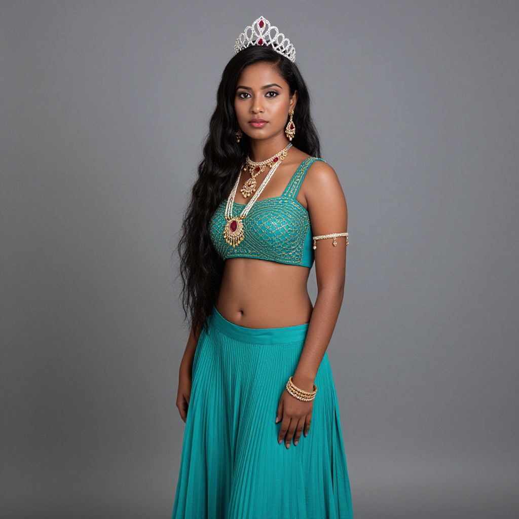 Photograph of a beautiful young woman with long, wavy black hair, wearing a silver tiara, a shimmering teal crop top with intricate gold embroidery, and a flowing turquoise skirt. She is adorned with gold and green jewelry, including a large pendant, earrings, and armlets. Her dark brown skin contrasts with her vibrant outfit. The background is a plain, gradient gray, highlighting her elegant attire and poised stance. She stands confidently with a slight smile, exuding regal grace.