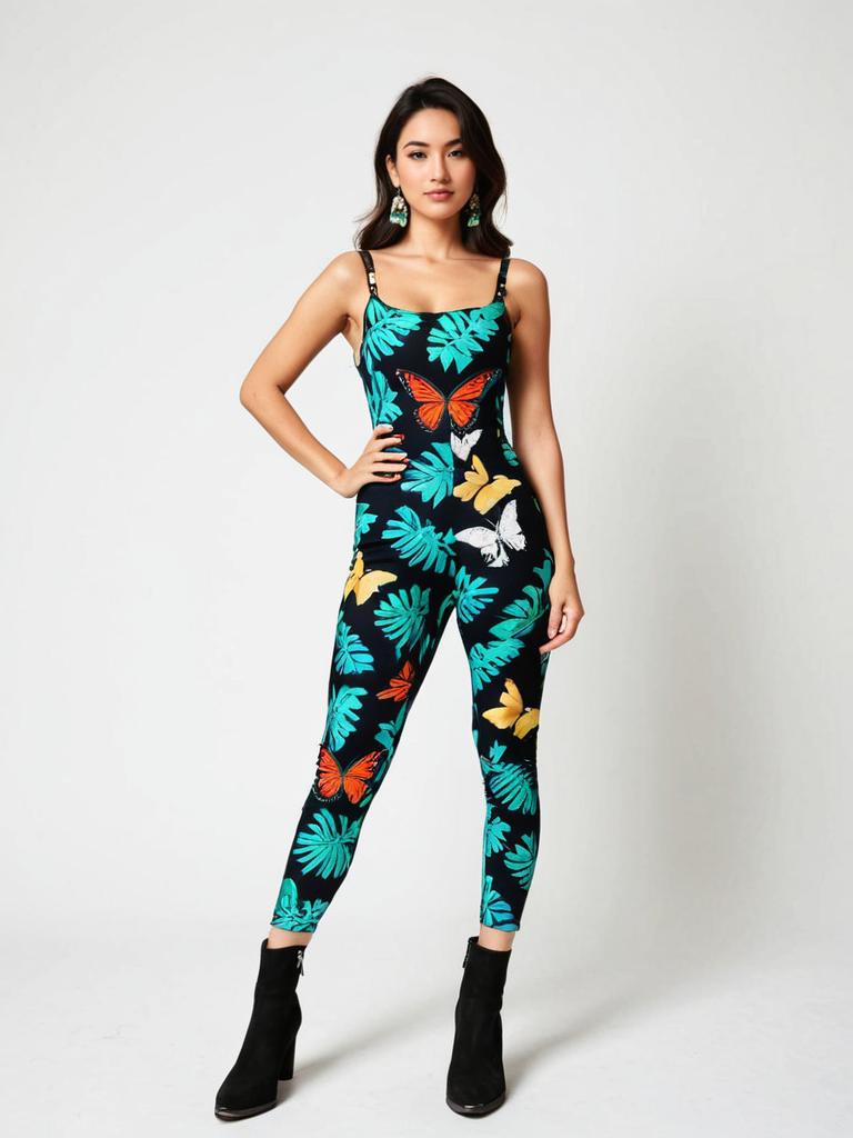 Woman, playful retro vibe, printed spandex bodysuit with tropical and butterfly motifs in vibrant colors, scoop neckline, thin shoulder straps, fitted silhouette, plain black ankle boots with chunky heels, white background.