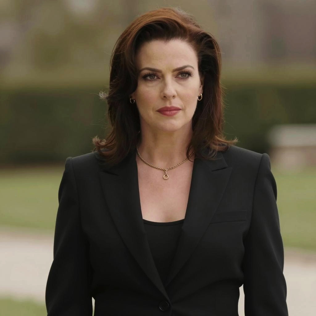 Photograph of a middle-aged woman with fair skin and dark brown, shoulder-length hair styled in loose waves. She has dark, defined eyebrows, brown eyes, and wears bold, red lipstick. She is dressed in a black, long-sleeved blazer over a black top, accessorized with small gold earrings and a delicate gold necklace with a small pendant. The background is blurred, featuring greenery and a pathway, suggesting an outdoor setting. The woman's expression is serious and focused, with her gaze directly at the camera. The overall style is professional and elegant.