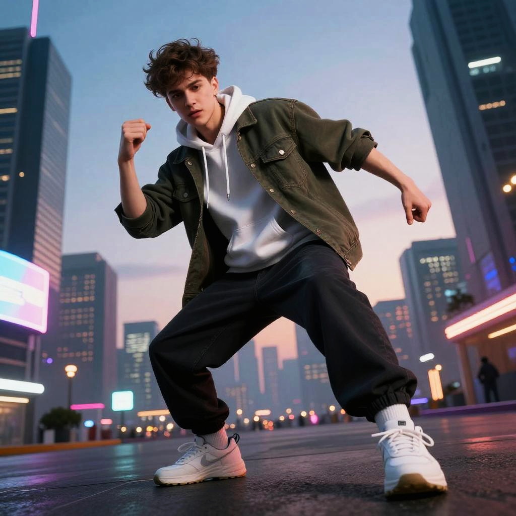 Boy sagging pants walking confidently down an urban street at sunset, graffiti walls, casual style, vibrant colors, dynamic pose, soft natural lighting