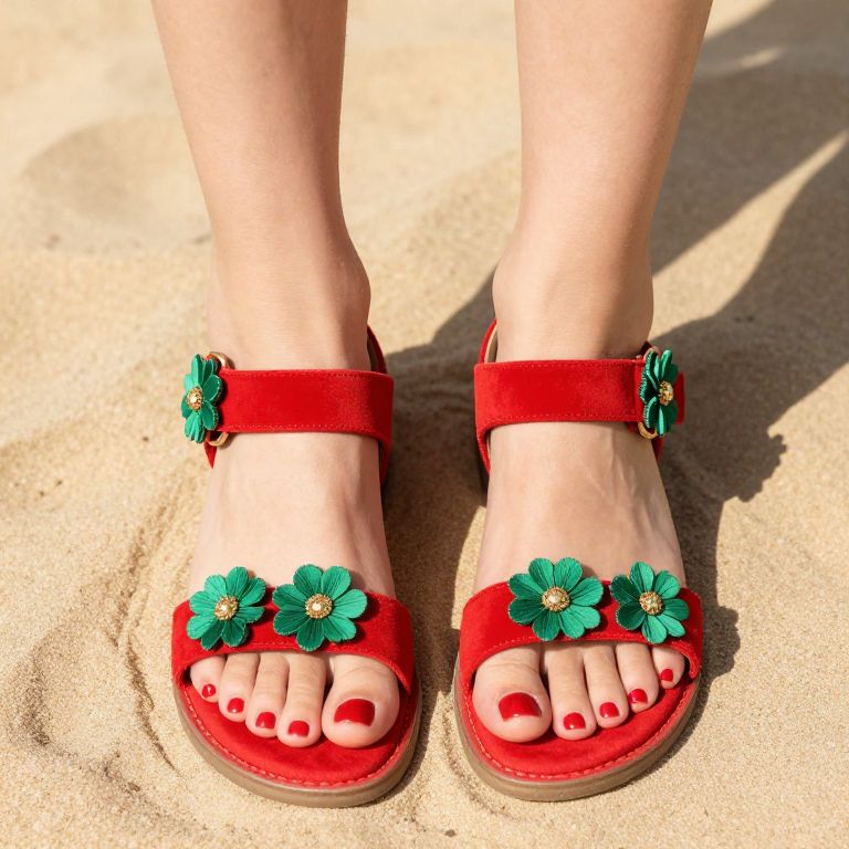 Feet adorned with vibrant red sandals featuring green floral embellishments and polished red nail polish stand gracefully against a sandy background, showcasing a summery and stylish aesthetic.