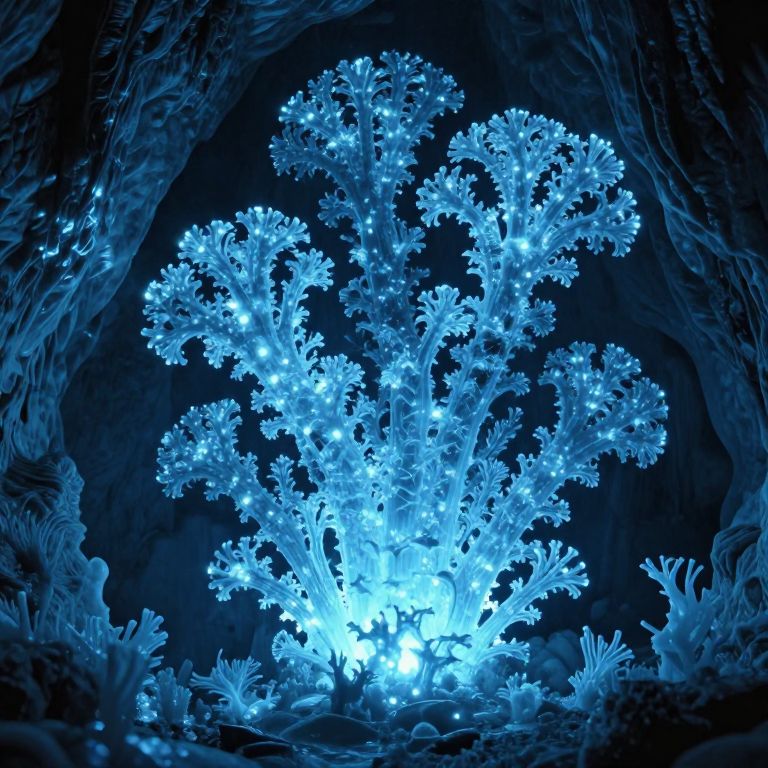 A mesmerizing 3D-rendered cavern bathed in ethereal blue light, where intricate layers of ice form a natural fractal pattern, evoking the luminous glow of crystalline algae communicating through synchronized bursts of light, reminiscent of a cyberpunk fantasy realm.