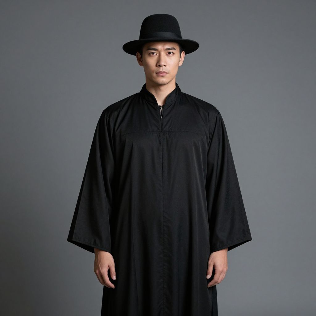 Photograph of an Asian man standing against a solid gray background. He wears a black, long-sleeved, button-up shirt that reaches to his thighs and a black wide-brimmed hat. His expression is neutral, with a slight gaze towards the camera. His skin is light, and he has short, dark hair. The lighting is even, highlighting the simplicity and formality of his attire. The overall style is minimalistic and modern, focusing on the contrast between the dark clothing and the gray background.