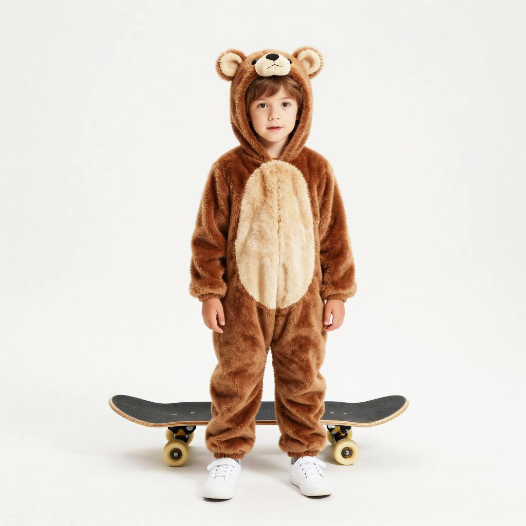 Young boy standing in front of a skateboard wearing a soft brown bear costume with a hood featuring bear ears and face. The boy has light brown hair and is wearing white sneakers. The background is plain white, emphasizing the child and costume.