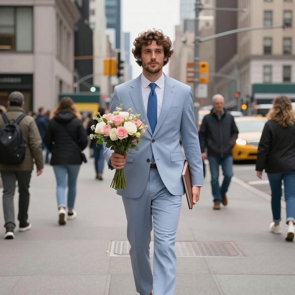 Photograph of a handsome, curly-haired man with a light beard walking down a bustling city street. He's wearing a light blue suit, white shirt, and blue tie, holding a bouquet of pink and white flowers in one hand and a brown folder in the other. The background shows tall buildings, street traffic, and pedestrians. The scene is bright and urban.