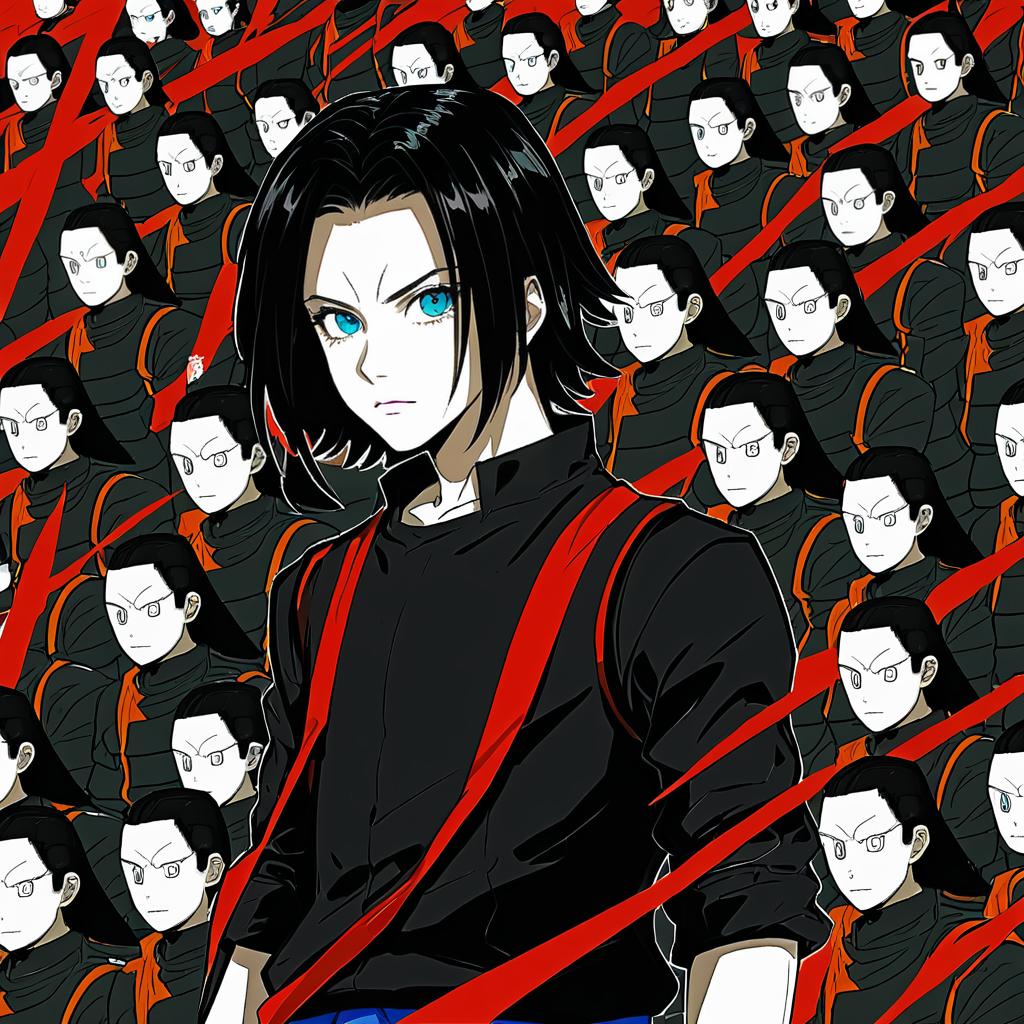 Android 17, dragon ball, 1boy, blue eyes, black hair, short hair, black shirt, red ribbon army, long sleeves, by artist hater (hatater), anime