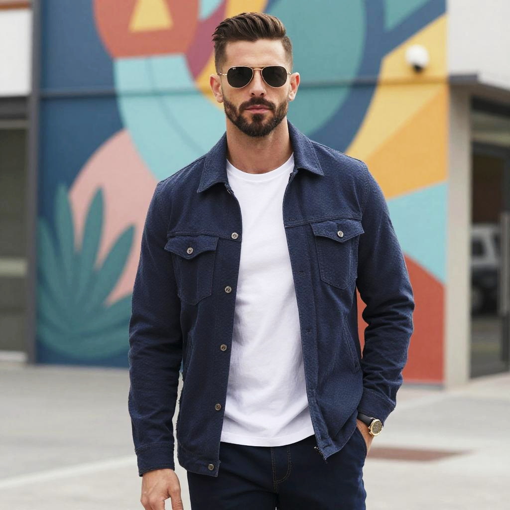 Photograph of a fit, bearded man with short dark hair, wearing dark aviator sunglasses, a navy blue denim jacket over a white t-shirt, and dark pants. He has his hands in his jacket pockets, exuding a cool, confident vibe. The background features a colorful mural with abstract shapes in blue, orange, and teal, and a partially visible storefront. The man's watch is visible on his left wrist. The image has a modern, urban feel.