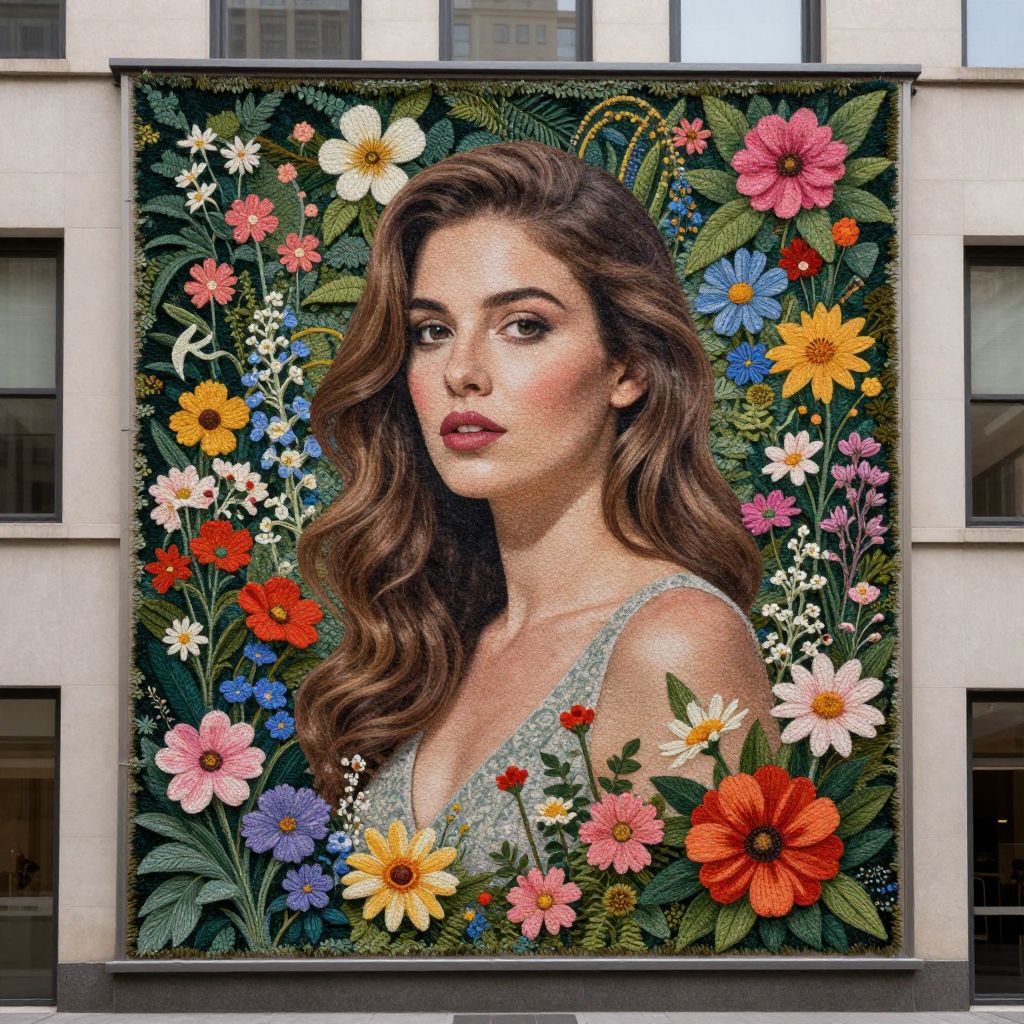 An urban facade transforms into a surreal masterpiece, where a life-sized portrait of a woman emerges seamlessly from a vibrant tapestry of blooming flowers and lush foliage, defying the boundaries between art and reality.