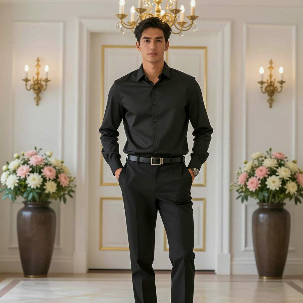 Photorealistic image of a young man standing confidently with hands in pockets, wearing a black button-up shirt paired with matching black pants and a belt with silver buckle. He has short black hair and a neutral expression. The setting is an elegant, well-lit room featuring white walls with gold trim, a white door, a chandelier, and large dark brown flower pots filled with pink and white flowers.