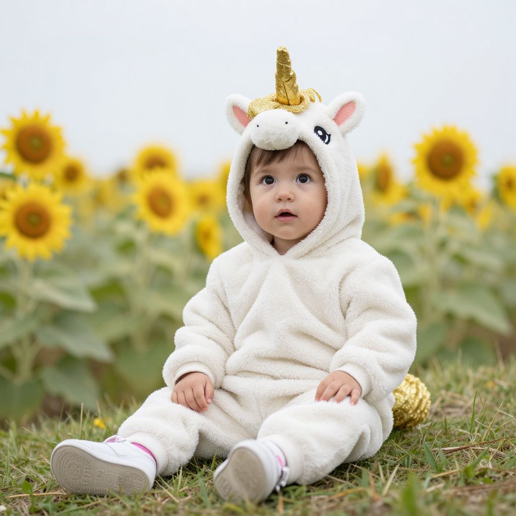 Toddler in Unicorn Costume Sitting in Sunflower Field