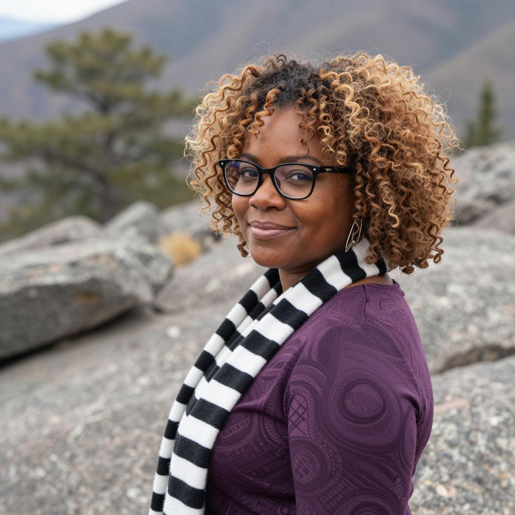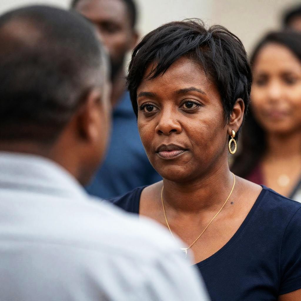 Black and white portrait of a Black woman with short natural hair, wearing large hoop earrings and a buttoned jacket with a name tag, speaking seriously at a conference podium in front of two microphones. The background is plain and blurred.